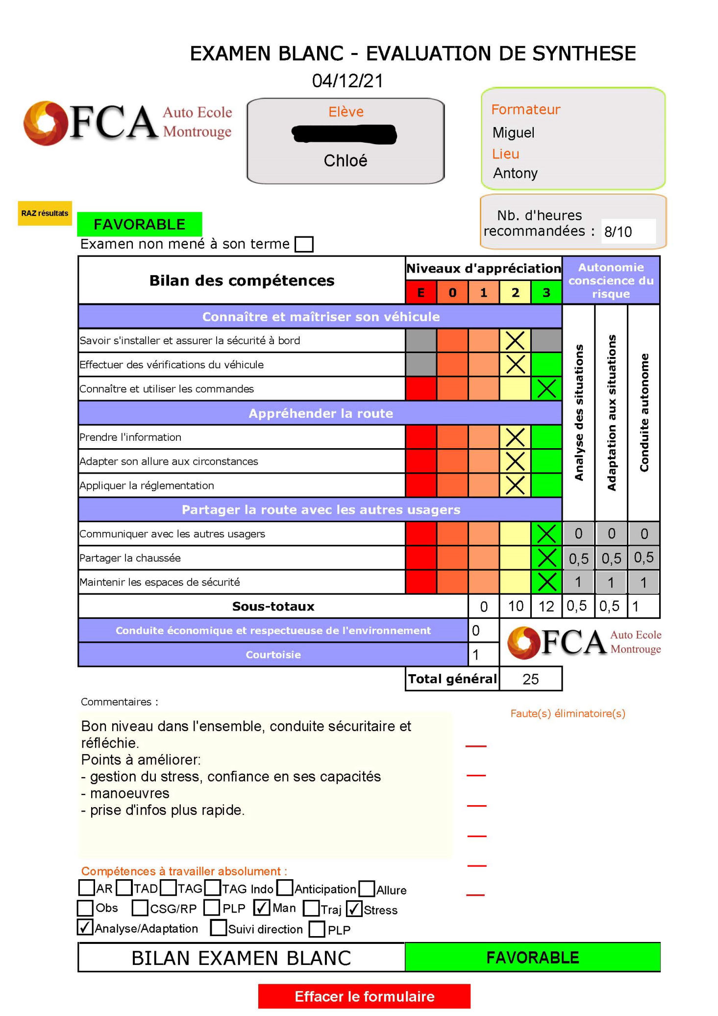 En fonction de la qualité de votre prestation lors de l’Examen Blanc, les dernières heures de conduite (6 minimum) seront programmées afin de vous préparer à l’examen final.